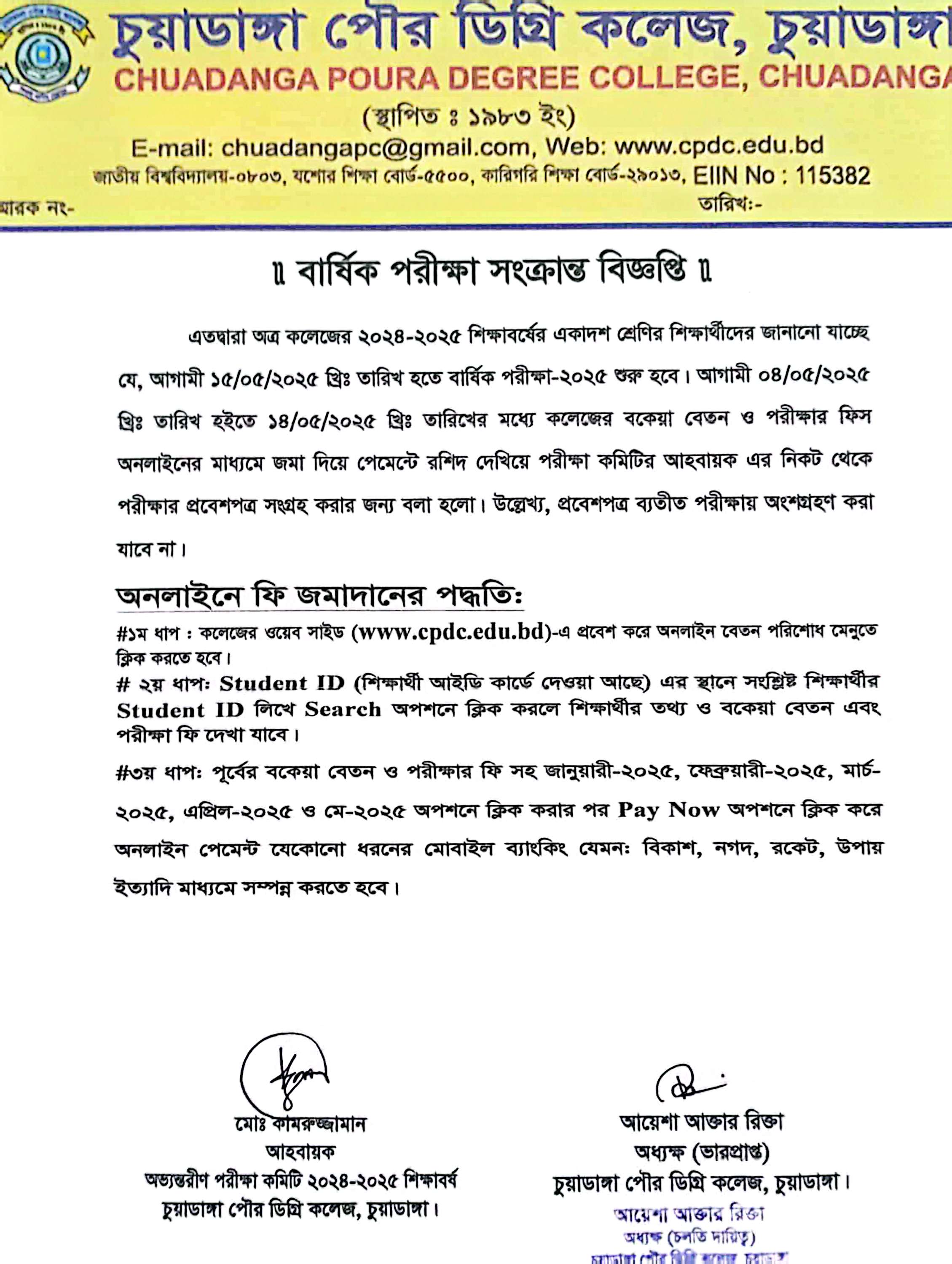 ২০২৪-২০২৫ শিক্ষাবর্ষের একাদশ শ্রেণির বার্ষিক পরীক্ষা সংক্রান্ত বিজ্ঞপ্তি